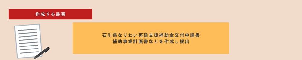 石川県なりわい再建支援補助金の書類を作成するには「石川県なりわい再建支援補助金交付申請書作成マニュアル」が石川県のホームページに掲載されていますので、マニュアルを参考に作成します。